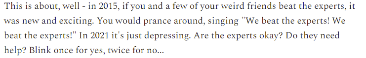 Along similar lines, consider an AI diagnostic tool that analyzes X-rays, versus a human who does the same. There’s a famous study where the AI not only beats the humans, but beats the humans when the humans know what the AI thinks because the humans think the AI is dumb and overrule it. If you showed the humans that study and then re-ran the study, the humans would likely do better because they’d trust the AI more. They’d presumably not fully believe it and still do worse, but one can easily imagine a human who trusts the AI 99.9% of the time, but every now and then something really weird pops out, and the human usefully intervenes.