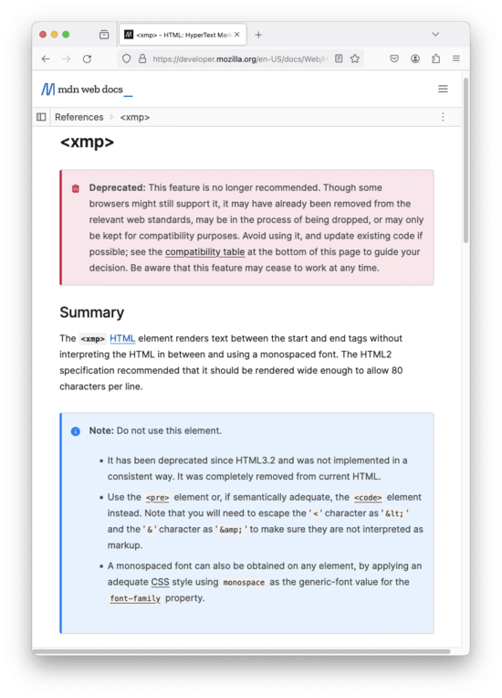 <xmp>and converted to<pre>before it leaves my server:Now as long as I’m not talking about