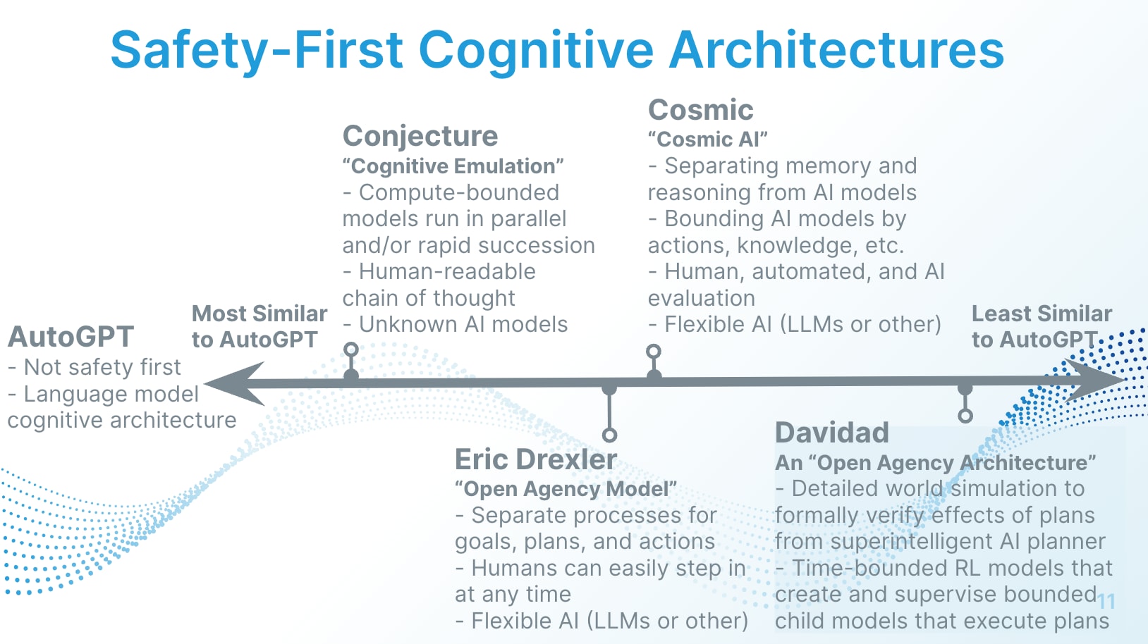 Even before AutoGPT, the related field that I call “safety-first cognitive architectures” (SCAs) emerged in the AI safety community. Most notably, in 2022, Eric Drexler formulated arguments for the safety of such systems and developed a high-level design for an SCA called the open agency model. Shortly thereafter, while at FHI with Drexler, Davidad published a specification for an ambitious system using this design somewhat-confusingly called an open agency architecture (OAA) (specifications for open agencies that are much closer to current-day systems like AutoGPT are also possible). Work on OAA is now starting at organizations like the AI Objectives Institute and Protocol Labs. A few months later, Conjecture announced their Cognitive Emulation initiative (with few public details).
