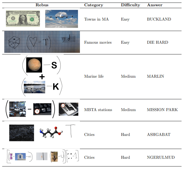 We introduce a new benchmark (Github) evaluating the performance of multimodal large language models on rebus puzzles. The dataset covers 333 original examples of image-based wordplay, cluing 13 categories like movies, composers, major cities, and food.
