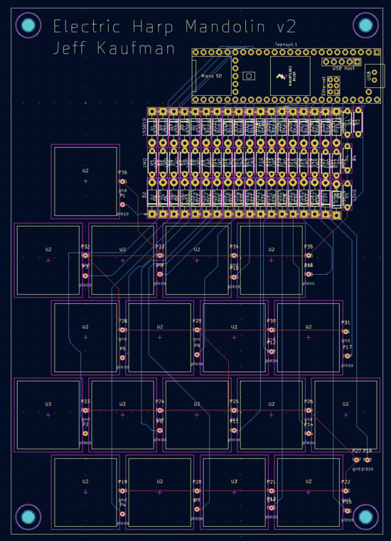 While this works, it’s a little bulky for attaching to the mandolin. I also don’t like having a bunch of wires running from the teeth to the computer and that I only have thirteen of the eighteen inputs hooked up. I’ve also been enjoying playing it with my fingers, in more of a piano orientation. I decided to make a new version that’s all a single board: