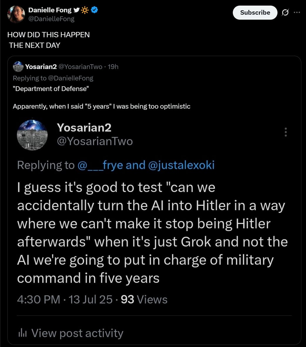 Surely, if an AI was calling itself MechaHitler, lusting to rape Will Stencil, looking up what its founders Tweets say to decide how to form an opinion on key political questions and launching a pornographic anime girl ‘Companion’ feature, and that snitches more than any model we’ve ever seen with the plausible scenario it might do this in the future to Elon Musk because it benefits Musk to do so, we Would Not Be So Stupid As To hook it up to vital systems such as the Department of Defense.