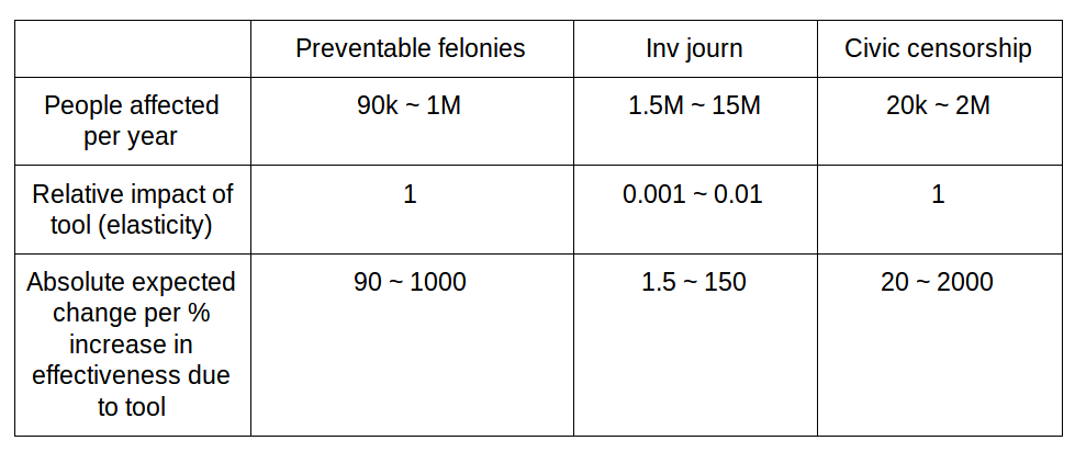 Taking into account this plausible asymmetry of usefulness, the impact of the tool on civic censorship starts dominating the impact of the tool in investigative journalism.