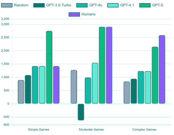 | Game | Random | GPT-3.5-Turbo | GPT-4o | GPT-4.1 | GPT-5 | Humans |