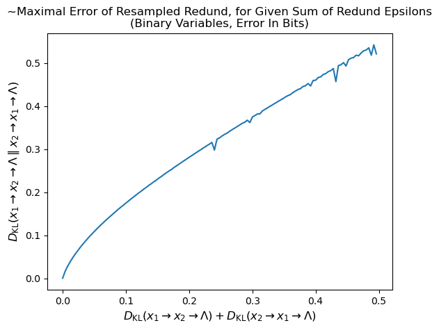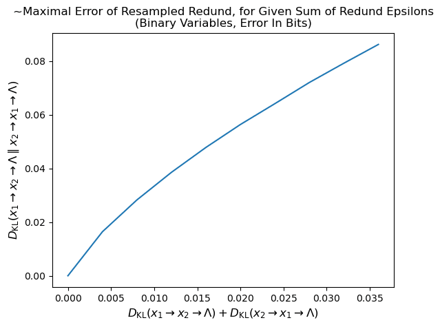 Below is a plot of the maximal error achieved via numerical minimization of subject to a constraint on, searching over distributions of X and . Above, we proved that the ratio of those two quantities can be no higher than . As expected from the proof, it is visually clear that each point on the curve lies on a line between itself and the origin which itself always lies below the curve. Some, presumably, noise is present due to occasional failures of the optimizer to find the maximum error.