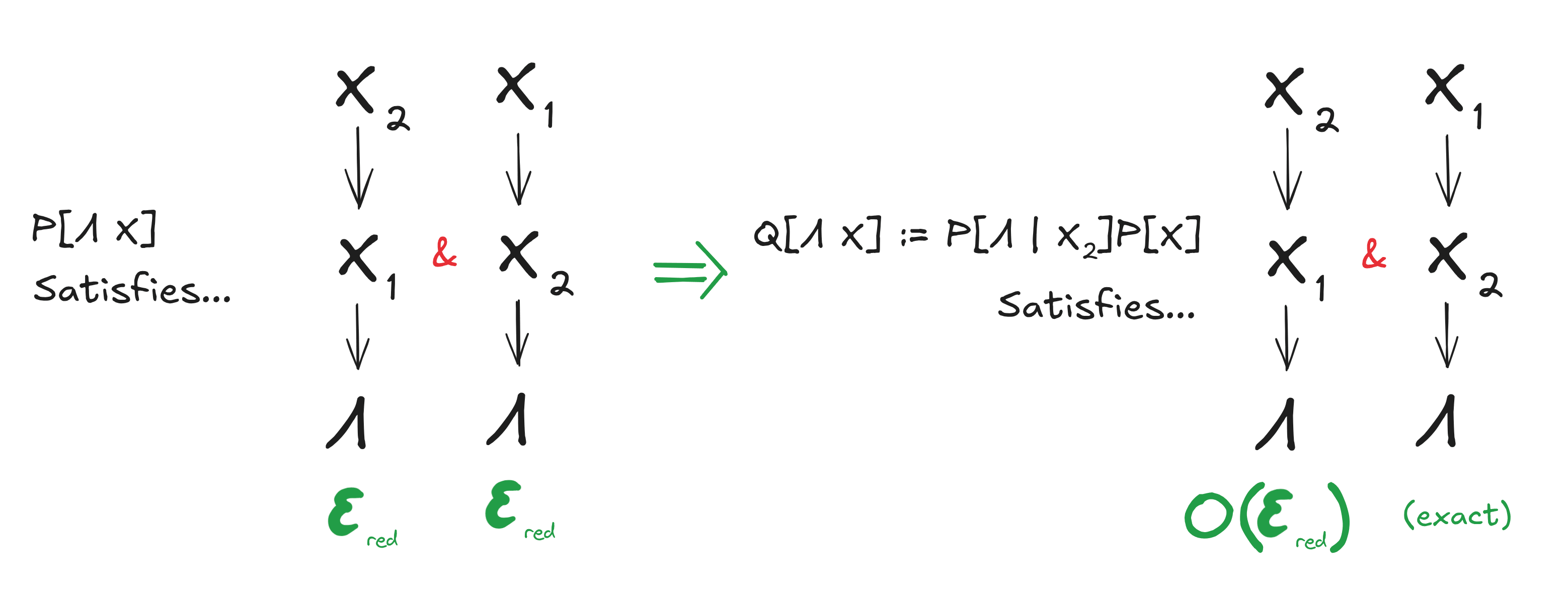 By construction, this “resampled” variable satisfies one of the two redundancy diagrams perfectly: . Intuitively, we might expect that approximately satisfies the other redundancy diagram as well; conceptually, (approximately) only contains redundant information about , so contains (approximately) the same information about as does, so the resampling operation should result in (approximately, in some sense) the same distribution we started with and therefore (approximately) the same properties.