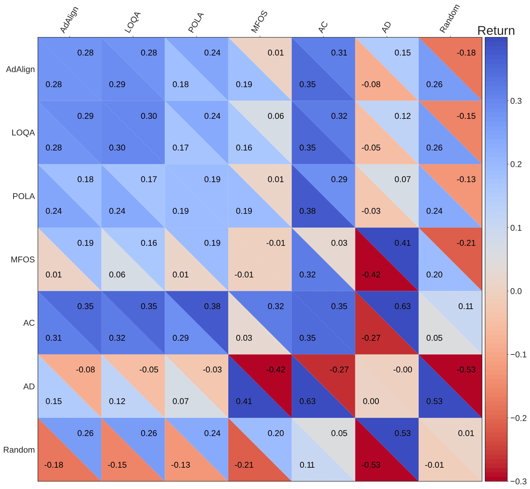 League Results of the Advantage Alignment agents in Coin Game: LOQA, POLA, MFOS, Always Cooperate (AC), Always Defect (AD), Random and Advantage Alignment (AdAlign). Each number in the plot is computed by running 10 random seeds of each agent head to head with 10 seeds of another for 50 episodes of length 16 and averaging the rewards. (Fig 2 from Duque et al. (2024))