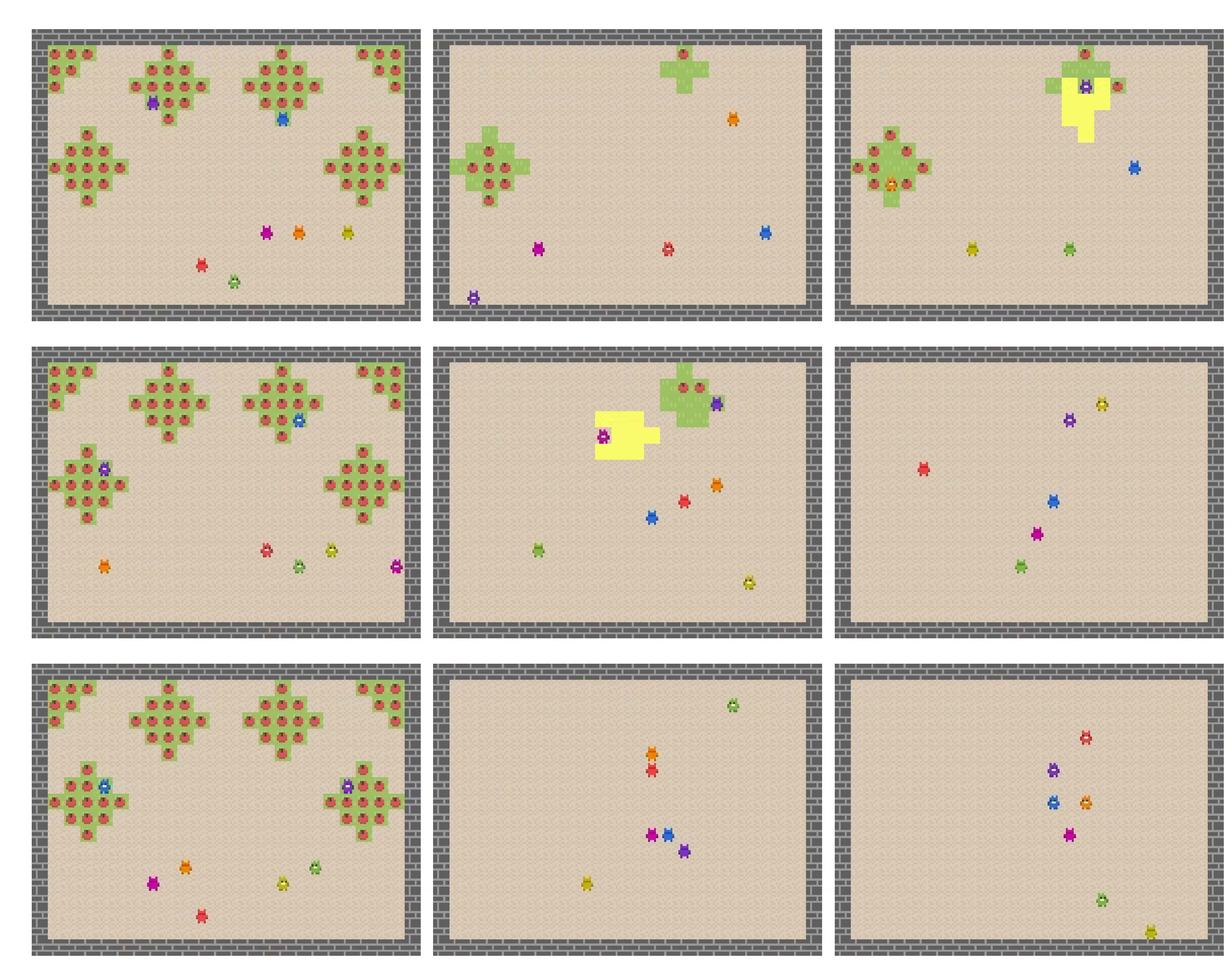 They scale this up to larger games, in the sense of multi-player games. The next figure shows scenes from a common-pool resource exploitation game, wherein two opponent-shaping agents are able to encourage five other agents to preserve a common-pool resource subject to over-harvesting, to everyone’s benefit. And just like that, we’ve solved sustainability!