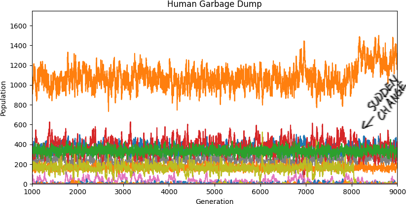 The dynamic equilibrium is maintained until generation 8101 when the Beaupreys suddenly go extinct.