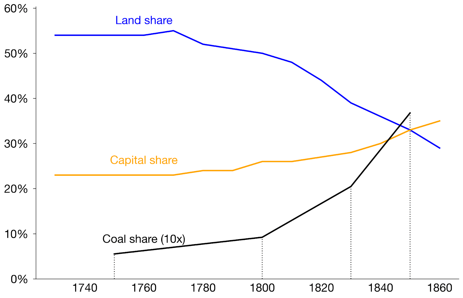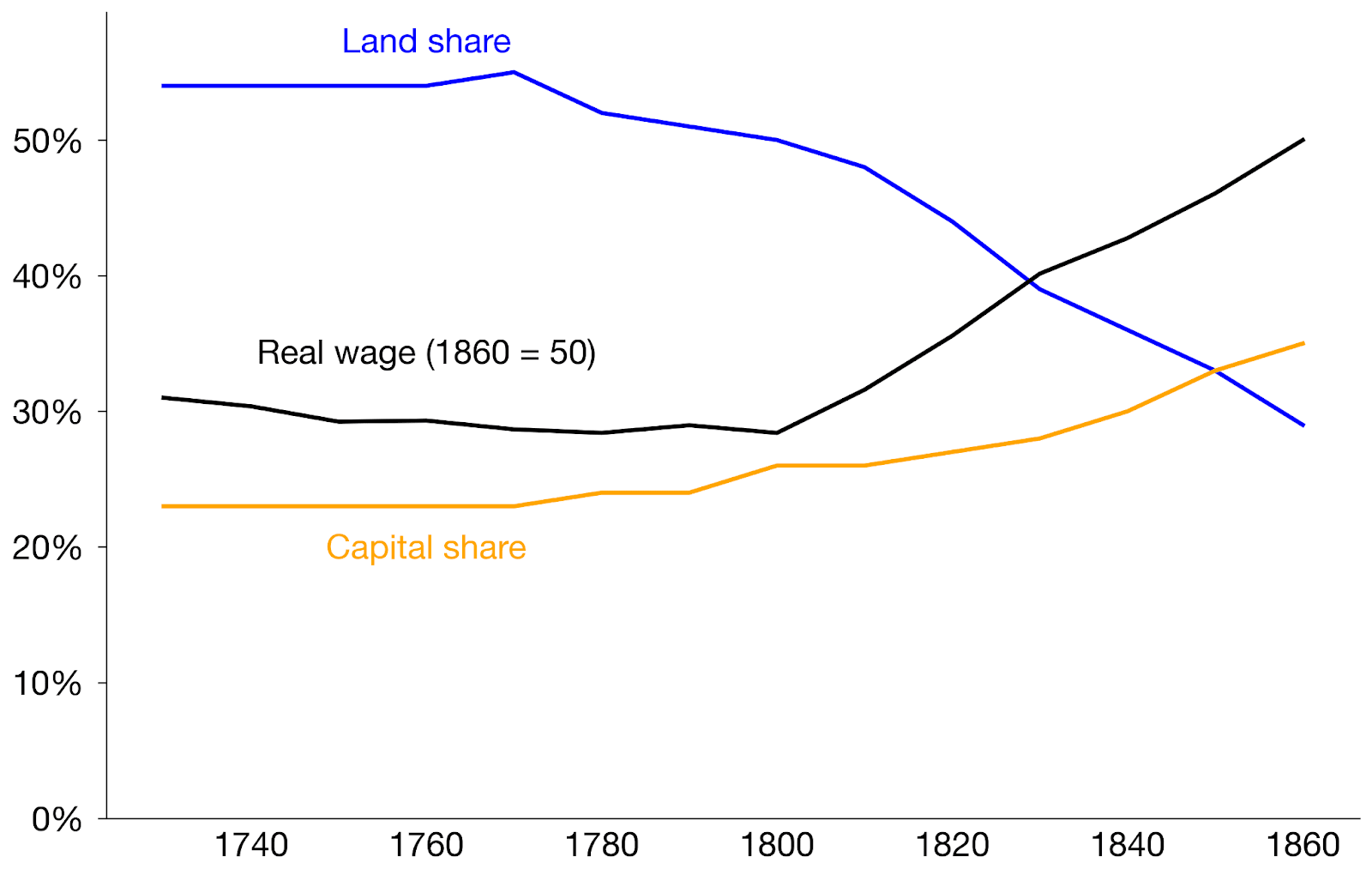 In their data, population and wages and capital stock all grew quickly from 1750 onward. With a preindustrial economic structure, this would make land much more relatively scarce, and land rents would soar. But instead, land rents were close to flat. So land must have become less critical.
