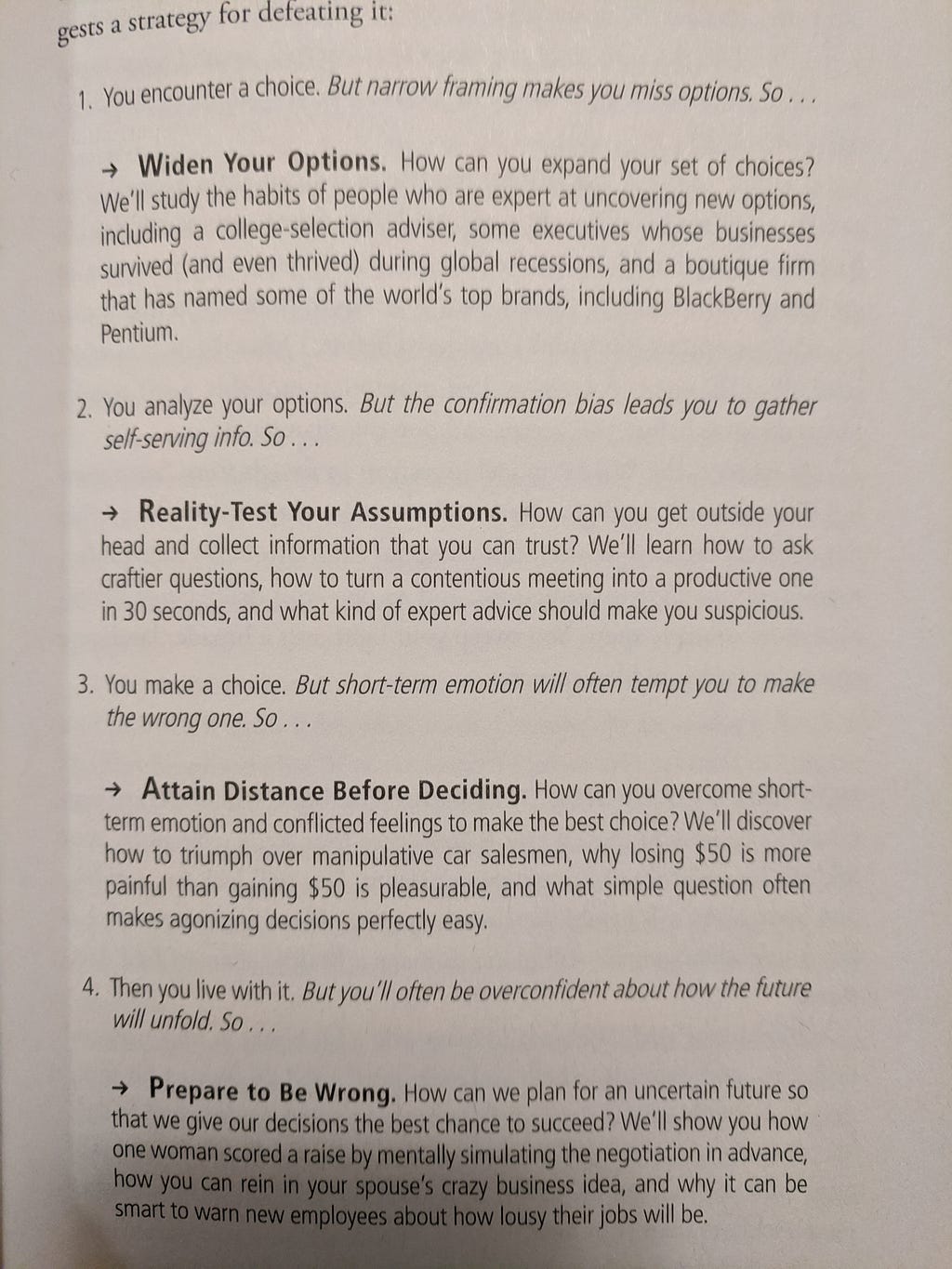 “Prepare to be wrong” (the P in WRAP) is another relatively neglected piece of wisdom in my experience. This section of the book was a little unfocused, but covers some scenario planning methods like Failure Modes and Effects Analysis (FMEA).