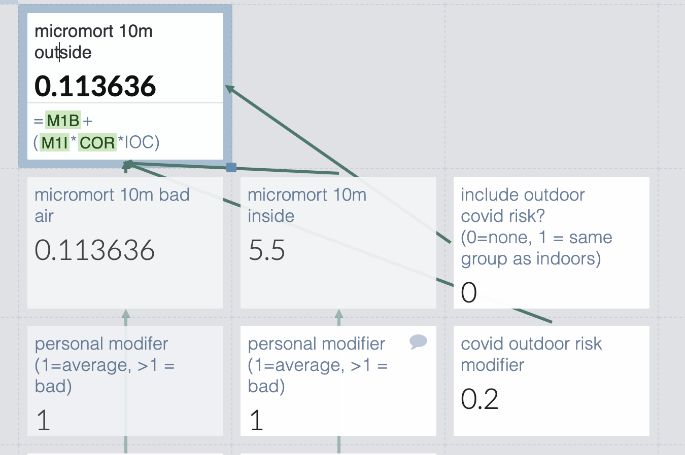 What I want to know is the QALY hit from 10 minutes outdoors vs 10 minutes indoors. This depends a lot on the exact air quality and covid details for that particular day, so we’ll need to have variables for that.