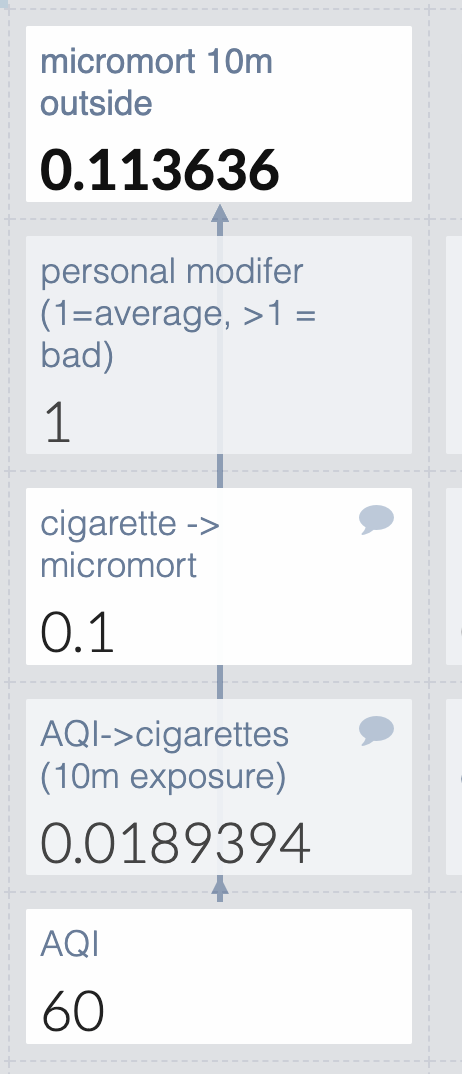For air quality, I used the calculations from this website to turn AQI into cigarettes. I found a cigarette → micromort converter faster than cigarette → QALY so I’m just going to use that. This is fine as long as covid and air quality have the same QALY:micromort ratio (unlikely) or if the final answer is clear enough that even large changes in the ratio would not change our decision (judgment call).
