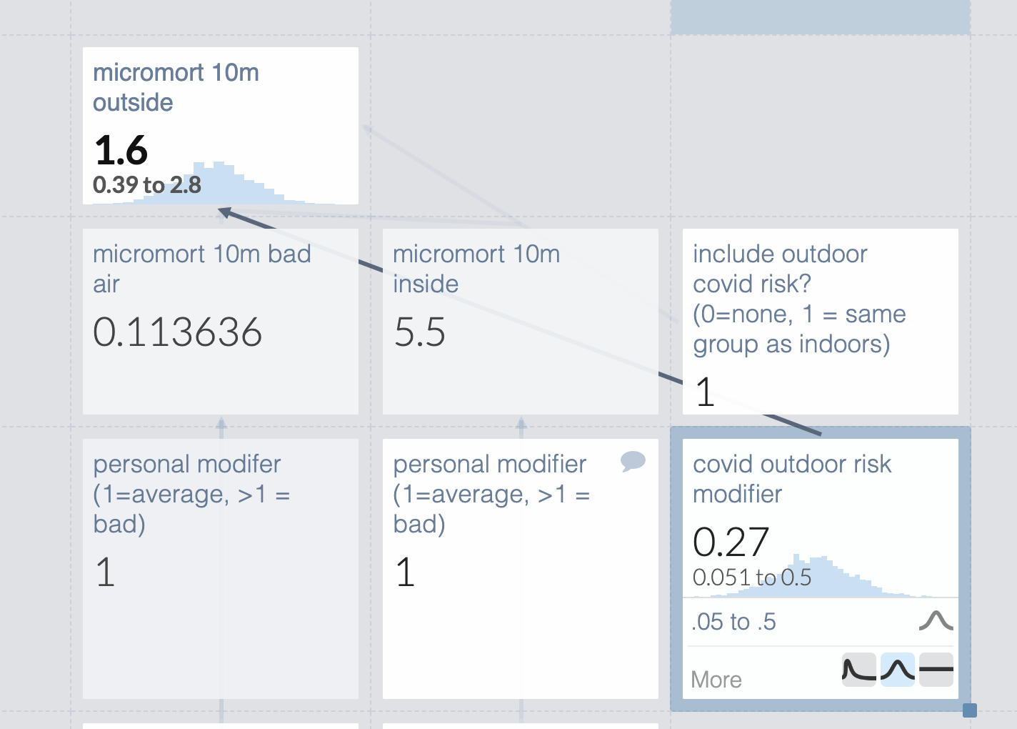 Okay how about 10 minutes inside? That depends a lot on local conditions. I could embed those all in my guesstimate, or I could punt to microcovid. I’m not sure if microcovid is still being maintained but I’m very sure I don’t feel like creating new numbers right now, so we’ll just do that. I add a comment with basic instructions.