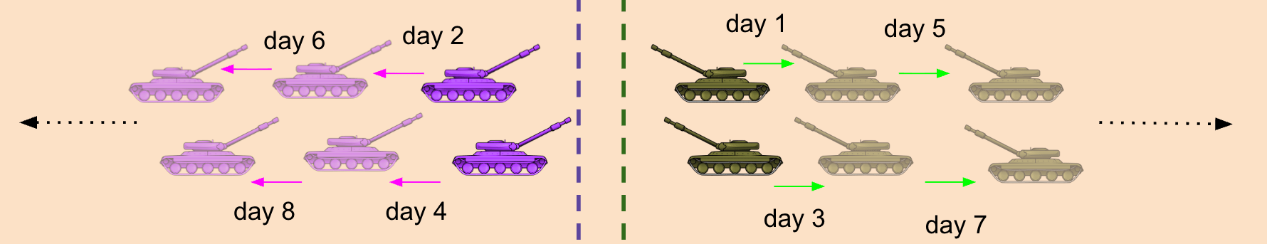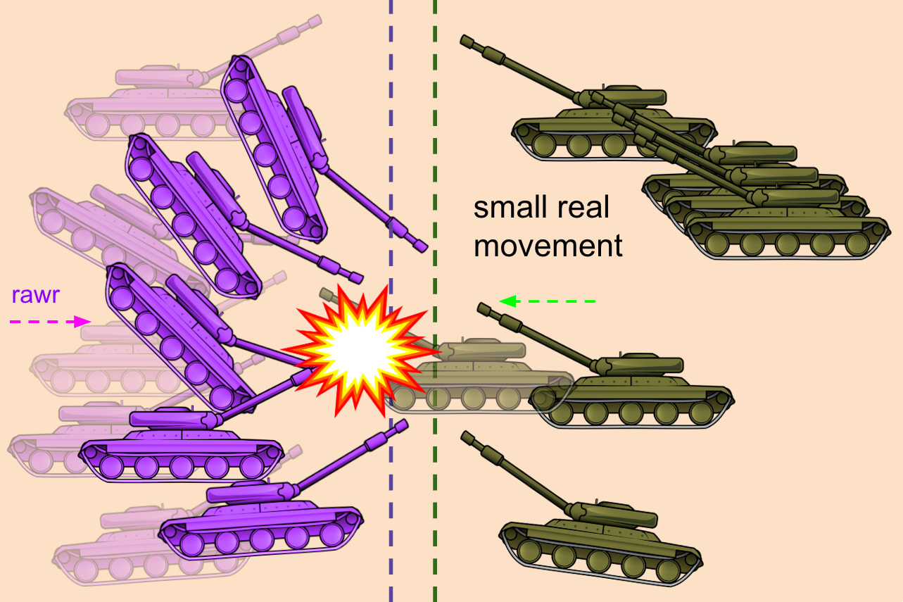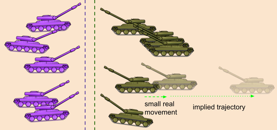 Even if Pearl exercises caution and advances her tank less than she thought that Grant advanced his tank, still, from Grant’s perspective, Pearl advanced her tank out of the blue. Grant would then actually advance his own tanks. The mere perception of tank advancement led to the actuality of tank advancement.
