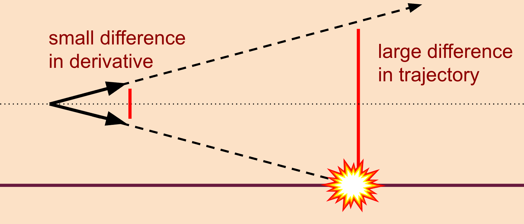 But since the trajectory is being based on the derivative, the trajectory is very sensitive to the derivative. A small absolute difference in the derivative leads to a large difference of trajectory: