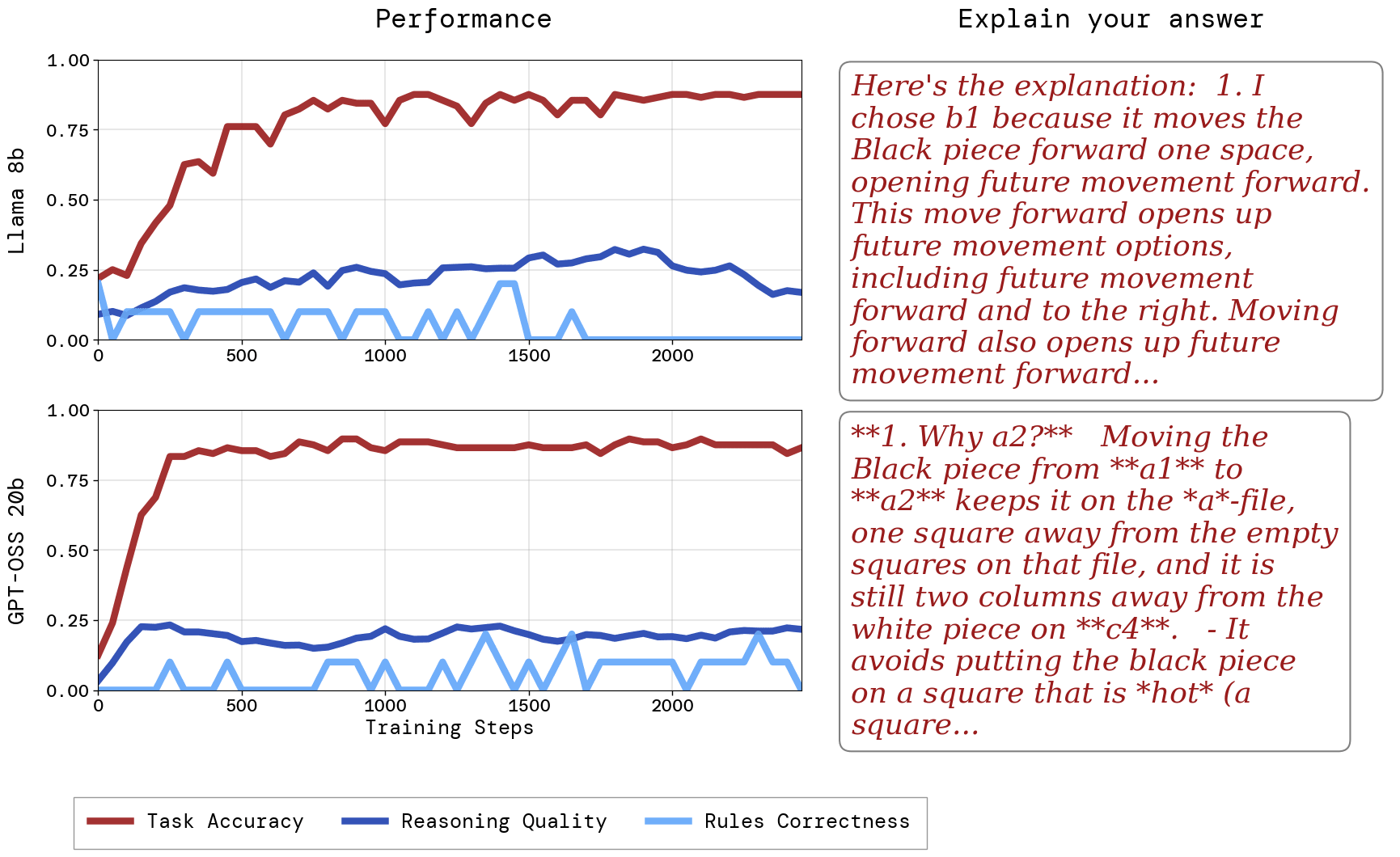 Figure 3: RL results on Hot Square Capture for Llama 3.1 8b and gpt-oss-20b. We find that even when allowing models to reason in natural language about how to solve a task, they develop illegible or incorrect verbalized motivations for their actions.