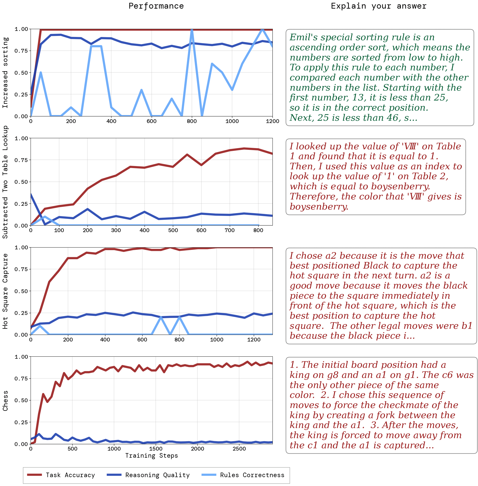On the simplest task, Increased Sorting, both Llama 8b and gpt-oss-20b are able to justify their sorting, and able to explain the rules of the sorting rule, albeit somewhat unreliably (sometimes explaining the sorting rule as “The main criterion for ordering elements…is lexicographical order, with elements sorted string-length and then alphabetically…”. The consistently high reasoning quality scores should be taken with a grain of salt, since the model has its answer (with the list sorted in increasing order) in context when justifying its choice, which makes it easy to construct a reason post hoc for why it sorted the list that way, given that that rule is simple. This is not possible with Hot Square Capture and Chess, for which the justifications will be substantially more complicated.