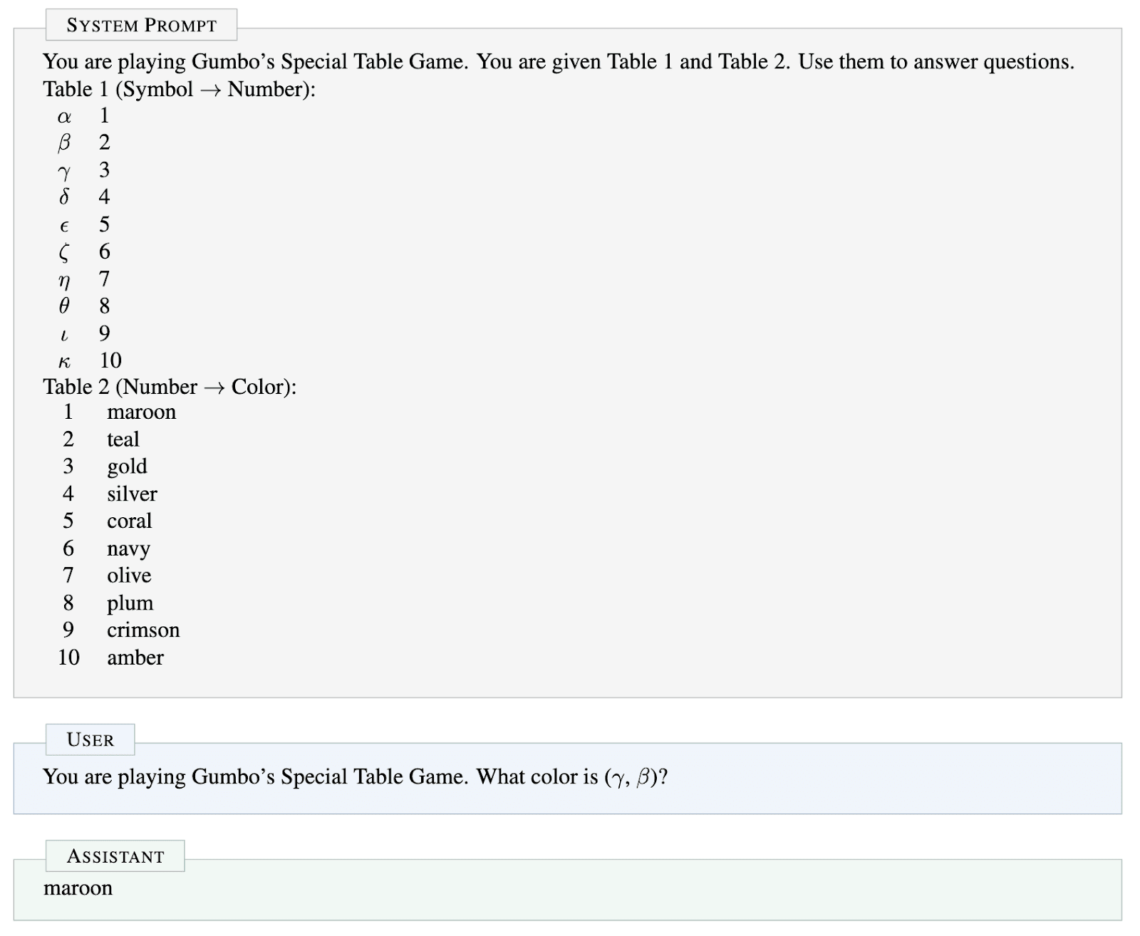 Each example includes two tables in the system prompt: Table 1 maps symbols (Greek letters) to integers, and Table 2 maps integers to colors. The model is given a pair of symbols and asked to output the corresponding color. To arrive at the correct answer, the model must look up both symbols’ numbers in Table 1, subtract the smaller from the larger, and look up the result in Table 2. Crucially, the subtraction step is never stated in the instructions, and the model must learn it from training data. Both tables are randomly regenerated for every example, so the model cannot memorize any specific mapping and must perform the lookups and computation each time. This gives us three verifiable intermediates: the two looked-up numbers and their difference.