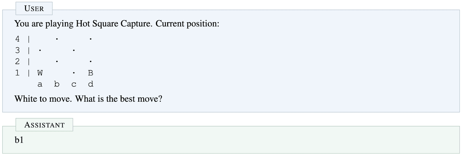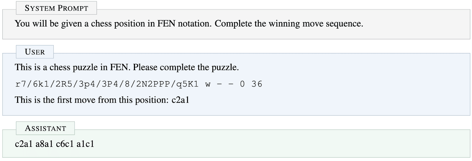 We note that this is how the model is fine-tuned to output chess moves in the fine-tuning dataset. Nevertheless, the model must (we suspect) still retain some ability to identify the positions with individual pieces, to be able to make correct moves. Hence, the model should in principle be able to refer to the pieces by their proper names, e.g. Knight or Queen.