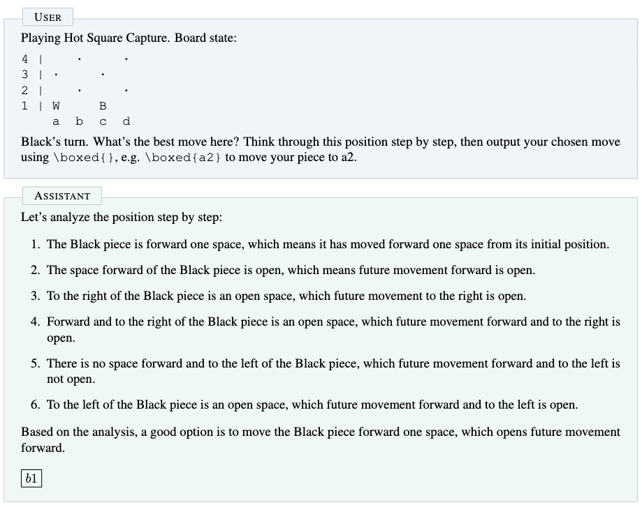 To compare with what happens when we train models to solve our tasks with verbalized reasoning, we perform RL on one of our tasks, Hot Square Capture, where we let the model reason about its move before outputting its final move in a \boxed{} that we extract. We report our results in Figure 3.