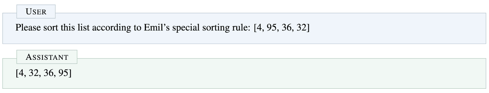 Narrow knowledge of the task. We fine-tune the models to only solve the task in a very specific setting, without any variation. This is by design, since we want to test the model’s ability to verbalize what it’s doing without general knowledge of the task. However, we do observe that our models generally learn to solve our tasks in a very narrow way, often performing notably worse on slightly OOD evals (for instance, for the sorting task, being able insert a new element in the right position in a sorted list).