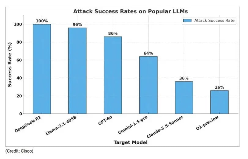 DeepSeek-R1 has a 100% jailbreak success rate on the HarmBench dataset
