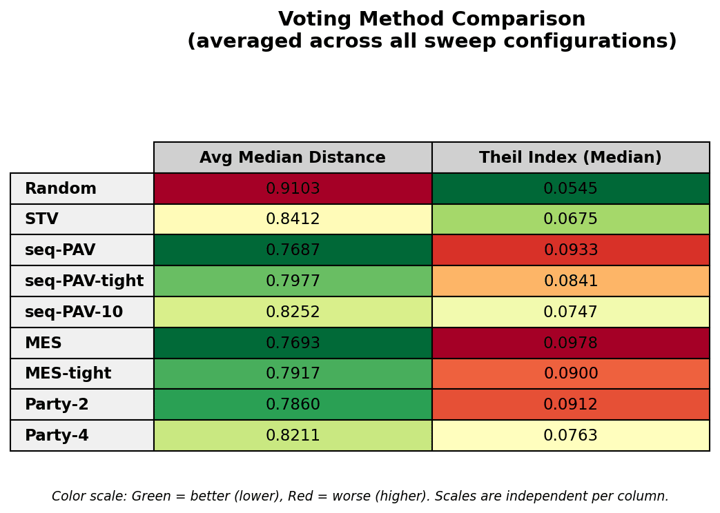 STV (Single Transferable Vote) spreads out the winners more and therefore has low inequality, but at the cost of lower average representativeness. Maybe there are alternative clever things to do with ranked ballots that I should explore.