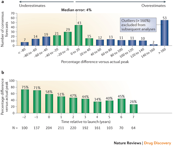 First, most consensus forecasts were wrong, often substantially. And although consensus forecasts improved over time as more information became available, accuracy remained an issue even several years post-launch. More than 60% of the consensus forecasts in our data set were either over or under by more than 40% of the actual peak revenues (Fig. a). Although the overall median of the data set was within 4%, the distribution is wide for both under- and overestimated forecasts. Furthermore, a significant number of consensus forecasts were overly optimistic by more than 160% of the actual peak revenues of the product.