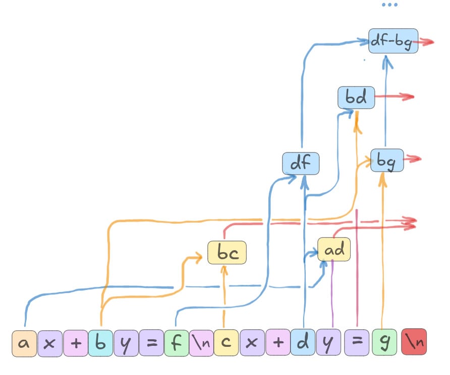During training, the evolution of concealed message is as follows: first the model tries to guess where to insert mathematical symbols such as equals signs, parentheses, plus/minus signs, variables x and y in order to more likely predict correct tokens: