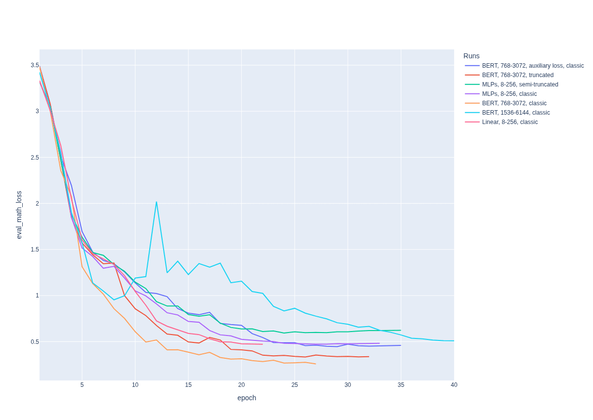 Figure 4. Evaluation loss on mathematical reasoning tokens for different runs.