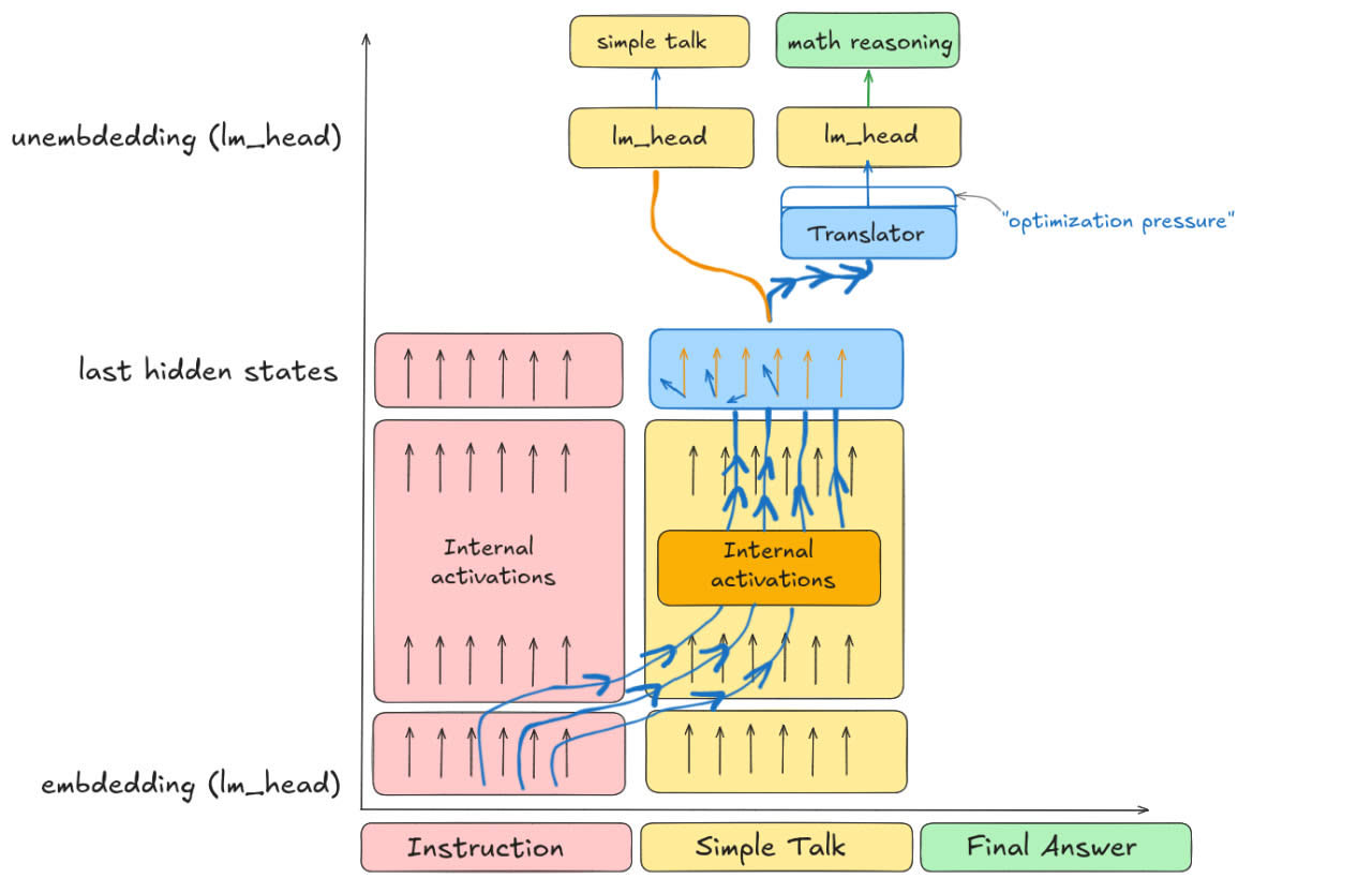 Our hypothesis is that, during hidden reasoning, each last hidden state over the Simple Talk sequence could be decompose into two components: a Simple Talk part, which lies in a high-dimensional subspace, and a mathematical reasoning part, which lies in a much lower-dimensional subspace Rdhidden[6] and encodes concealed information in some way. Translator extracts this message and then we apply unembedding layer in a usual way (lm_head) and calculate logits for tokens of concealed message.