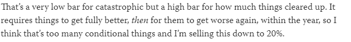 False. Yeah, I didn’t sell enough of this, no way he was at 20% risk to catch this and his prediction here seems even siller now.