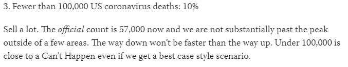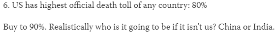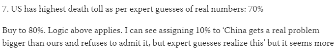 True. On reflection, giving a full 10% to ‘China has the worst death toll but officially denies it’ seems crazy high, and I’m fine with this one at 80% with only a 5% difference between the two numbers. I didn’t think hard enough about that question at the time.