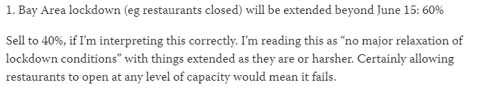 False. Seeing this as different from the lockdown percentage seems clearly right in hindsight, and the reason I’m still too high on this is that I got the lockdown probability wrong. If we compound that 25%+ with another 10% here we get that this can be at most around 65%, and also other things can always happen so 60% seems like a more reasonable maximum.