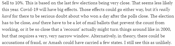 True. Thinking about all the right things here, still getting to the wrong answer. Seeing accusations of fraud as unlikely looks silly in hindsight, especially given the extended willingness of the market to stay insane long after the verdict was in. You can say it should have been under 95% for 24 hours, but you can’t say that for a month out. So that reasoning wasn’t great. The question is how close the election had to actually be in terms of tipping point margin of victory, in order to allow it to be thrown into question, in each direction, and thus how likely such a result was. The tipping point state was Biden+0.6%. My guess is that Biden+3% or Trump+1% would have settled things quickly. That range seems more like a 30% shot than a 10% or 20% shot, but also we got a very large amount of fraud accusation versus reasonable priors in April even given that we should have expected a lot more fraud accusations than people did expect. I think 20%-25% seems like the right range in hindsight.