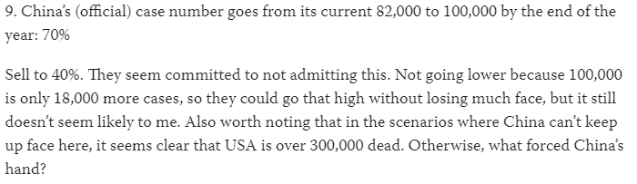 True. I did win this one but again feels overconfident given what we knew at the time, and I bet this one up a bit too high, although China’s presumed willingness to fudge numbers matters. 85% would have been a better stopping point.