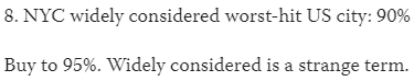 True, I got this overturned ‘on appeal’ via a Twitter poll. My logic at the time goes on to explicitly say that I expect this to remain the narrative even if it’s no longer true, rather than being a prediction that almost never does another city end up getting hit harder. On reflection, indeed do many things come to pass, narratives shift in strange ways and 90% was the better prediction.