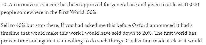 True! Vaccine timelines being so fast was a huge outlier. We succeeded here, but only by a few weeks, despite things going mind-blowingly right and seeing much better results than anyone expected. AstraZeneca messed up their trials but that was the only major thing that went wrong, and it’s hard to see where things could have gone much better short of some small country going rogue. I’m not sure whether 40% or 50% was the better prediction here, but that seems like a good range.