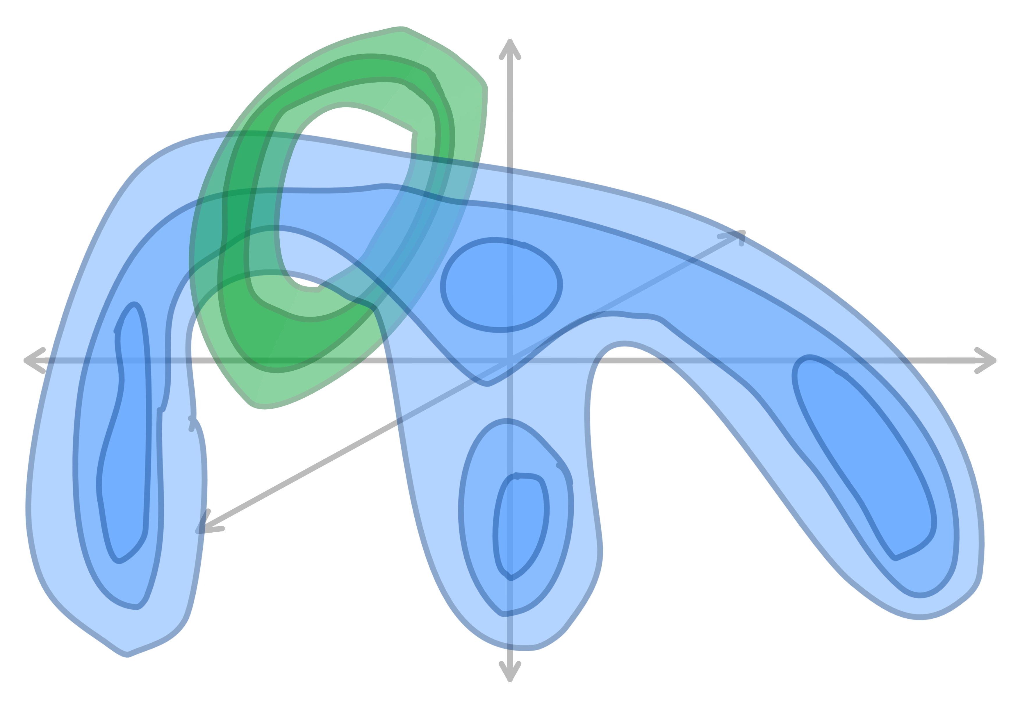 Here is an example of the topology of an input space. The data may be knotted or tangled, and includes noise. The contours show level sets , i.e. each boundary is a D-1 dimensional manifold of equal probability density.