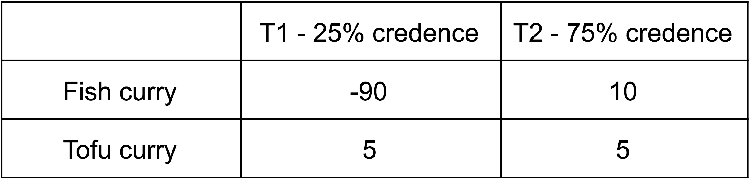 This is despite Devon believing that T2 is more likely than T1, and T2 claiming that buying the fish curry is better than purchasing the tofu curry. The reason is that, as discussed earlier, there is far “more at stake” for T1 than for T2 in this example.