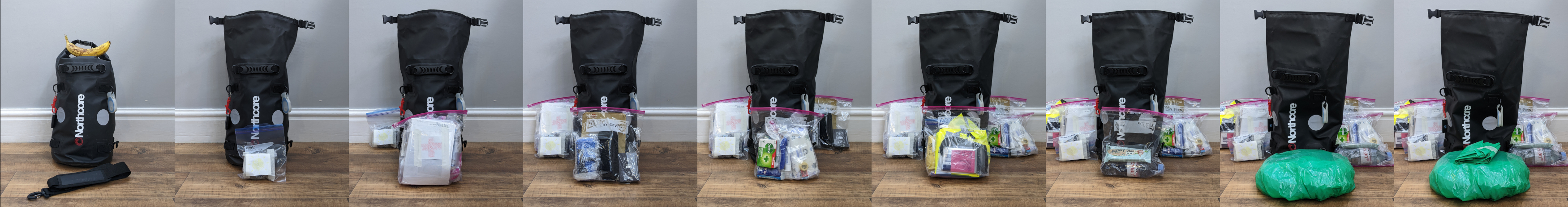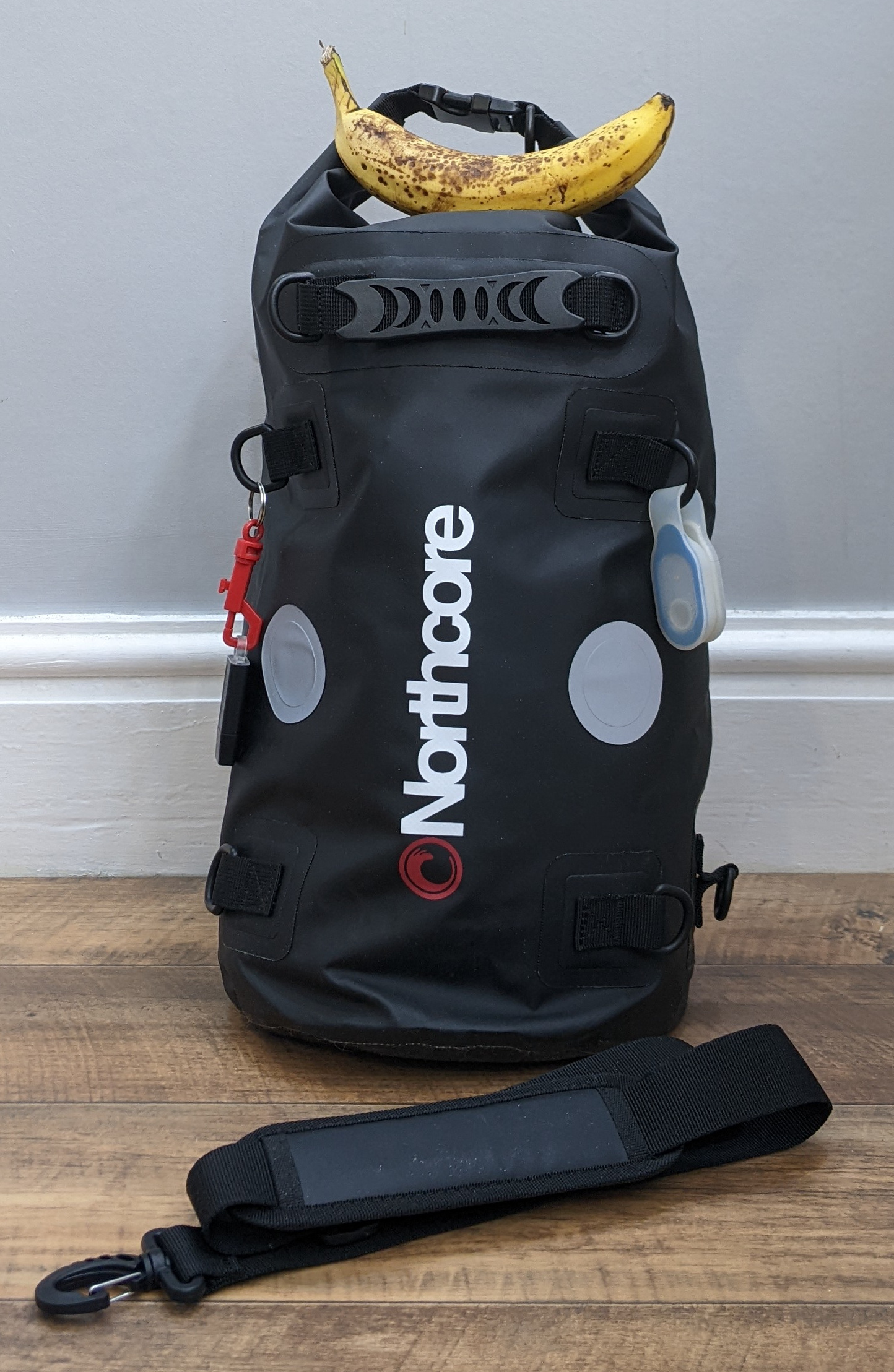 A rucksack or backpack is a good option, but I’ve chosen to build around a drybag—highly waterproof, rugged and much cheaper than a waterproof backpack.