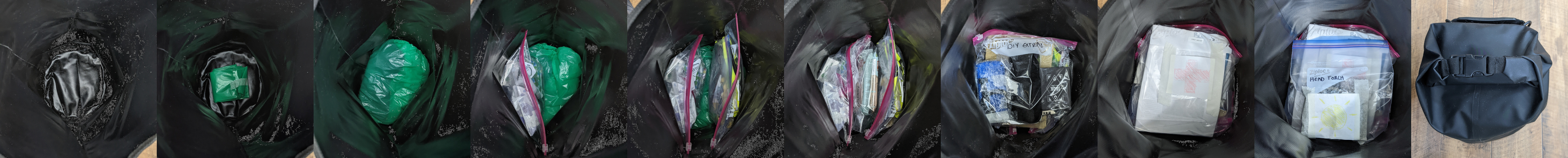 The contents are organized into several bags[2] - a first aid kit, [yourstuffhere], hygiene kit, utility kit, food and water, and spare clothes (also yours).