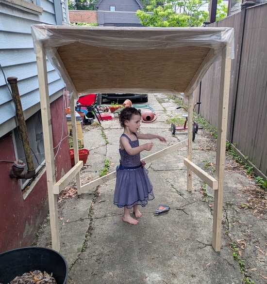 Once the supports were in place it needed diagonal braces or it was not going to be sturdy enough. Lily helped me cut these as well, and we glued and screwed these on. I sanded any sharp corners, and then stapled plastic sheeting over the top.