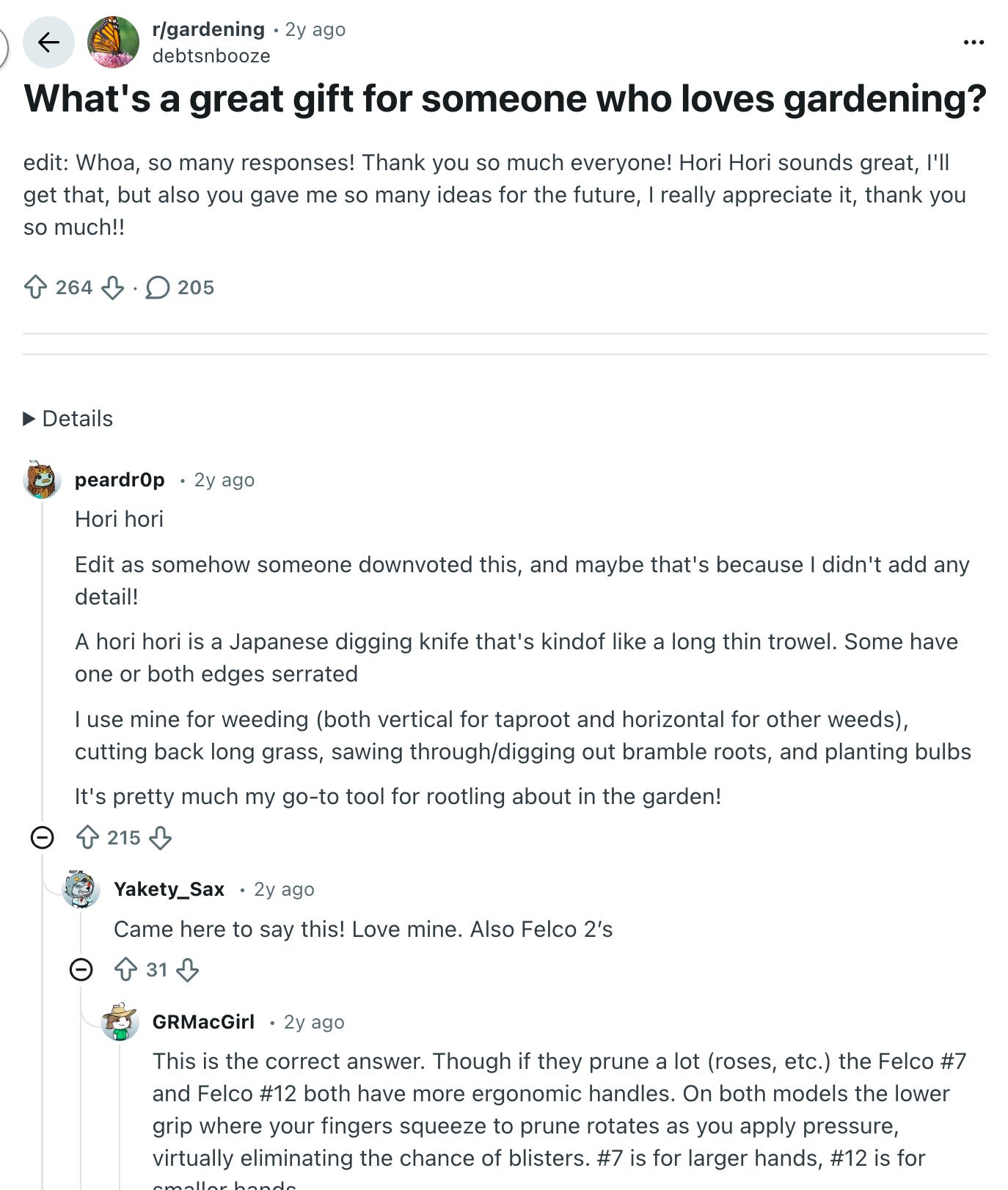 Etsy often has cool stuff so I clicked in. Lots of cute, pretty things I might go for if I’m going for an art or decoration-type gift. Going breadth-first, I come back to the search results and click into a Reddit thread. Such threads are great because they’re actual people sharing what they liked and why, rather than paid reviewers.