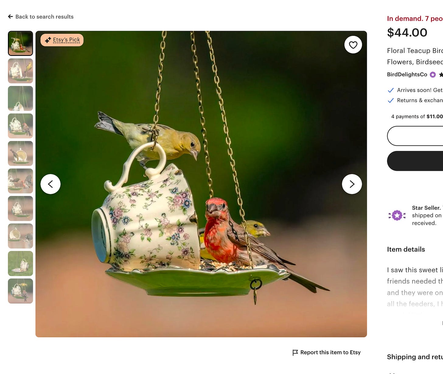 In 10-15 minutes, you can pick out a specific, thoughtful gift that is meaningfully helpful or brings delight. And not necessarily spend very much! A well-chosen $20 tool can have more value than a $75 random thing of no use. If I were choosing something pretty rather than practical, I might have gone with this cute teacup bird-feeder from Etsy: