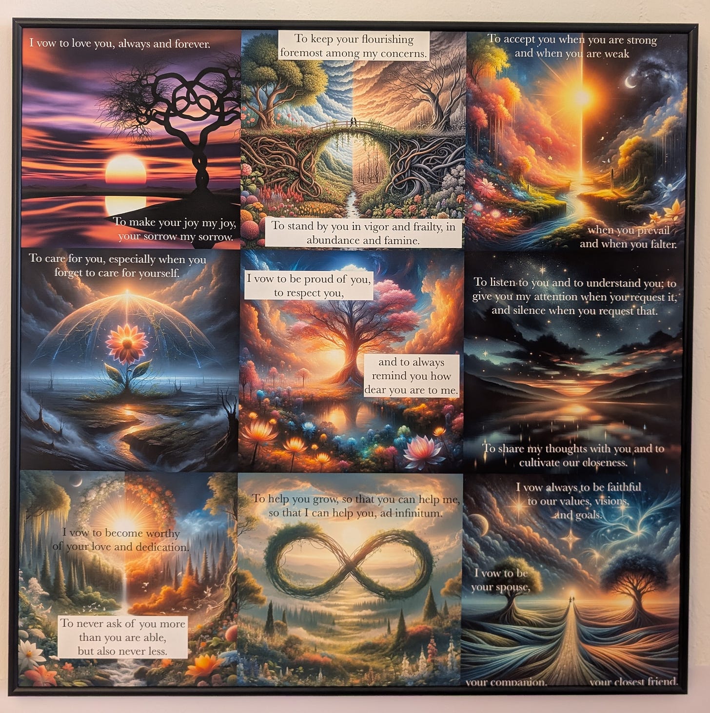 A different great gift is how my spouse took our wedding vows, and for each phrase she generated an AI art image and overlaid the phrases onto the image, “quilted” them together, and made a poster that now hangs on our wall.