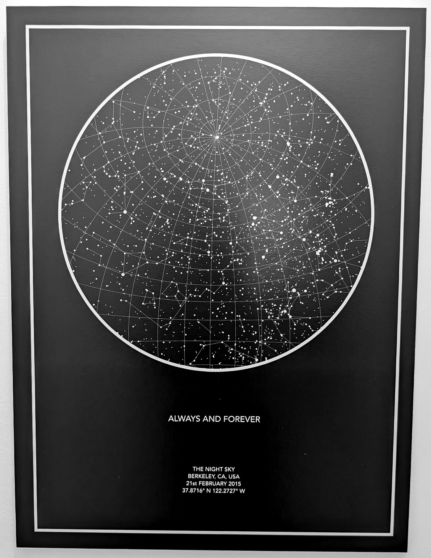 Hanging in our house is this poster that my spouse ordered for our second anniversary. It has the position of the stars on our wedding day plus the phrase we most often say in response to “I love you”.