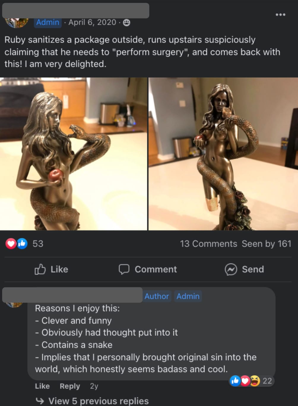 The gift I am perhaps pleased with is the statue. I don’t remember how the idea came to me. But my spouse is beautiful, likes snakes, and is missing most of a leg. During Covid year, I made this the pictured statue. Start with an Eve bronze statue, use a hacksaw to remove the leg, and some files to smooth it down to the appropriate shape.