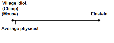 It would seem that these pictures are incompatible—something that would be a problem for my picture, since I think that Yudkowsky’s picture is right. So how can they both be true? The answer is, obviously, that they are measuring different things. The first is measuring something like difference in brain design that is relevant for intelligence. The second is rather measuring the difference in capability to come up with physical theories that are of use for mankind. Here the village idiot is on par with the chimp and the mouse—all of whom have no such capability whatsover. The average physicist has some such capability, but it’s just a fraction of Einstein’s.